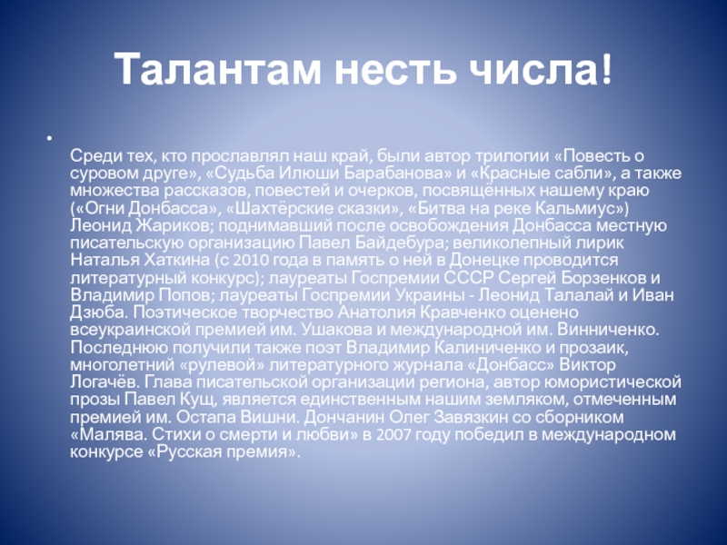 «Повесть о суровом друге», «Судьба Илюши Барабанова» и «Красные сабли», а также множества рассказов, повестей и очерков, посвящённых нашему краю («Огни Донбасса», «Шахтёрские сказки», «Битва на реке Кальмиус») Леонид Жариков; поднимавший после освобождения Донбасса местную писательскую организацию Павел Байдебура; великолепный лирик Наталья Хаткина (с 2010 года в память о ней в Донецке проводится литературный конкурс); лауреаты Госпремии СССР Сергей Борзенков и Владимир Попов; лауреаты Госпремии Украины - Леонид Талалай и Иван Дзюба. Поэтическое творчество Анатолия Кравченко оценено всеукраинской премией им. Ушакова и международной им. Винниченко. Последнюю получили также поэт Владимир Калиниченко и прозаик, многолетний «рулевой» литературного журнала «Донбасс» Виктор Логачёв. Глава писательской организации региона, автор юмористической прозы Павел Кущ, является единственным нашим земляком, отмеченным премией им. Остапа Вишни. Дончанин Олег Завязкин со сборником «Малява. Стихи о смерти и любви» в 2007 году победил в международном конкурсе «Русская премия».