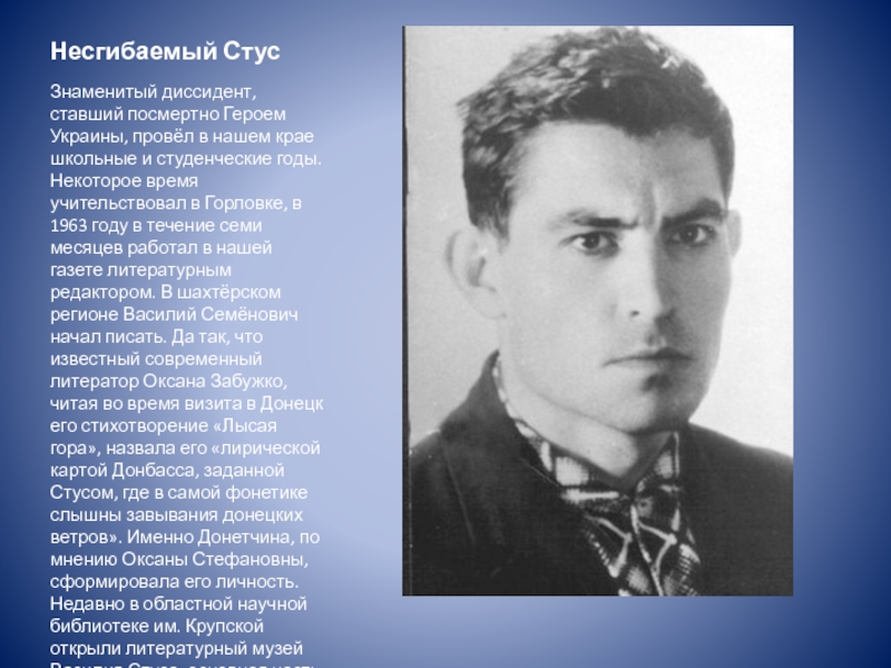 школьные и студенческие годы. Некоторое время учительствовал в Горловке, в 1963 году в течение семи месяцев работал в нашей газете литературным редактором. В шахтёрском регионе Василий Семёнович начал писать. Да так, что известный современный литератор Оксана Забужко, читая во время визита в Донецк его стихотворение «Лысая гора», назвала его «лирической картой Донбасса, заданной Стусом, где в самой фонетике слышны завывания донецких ветров». Именно Донетчина, по мнению Оксаны Стефановны, сформировала его личность. Недавно в областной научной библиотеке им. Крупской открыли литературный музей Василия Стуса, основная часть которого перекочевала из Горловки.