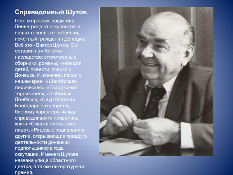 - от забвения, почётный гражданин Донецка. Всё это - Виктор Шутов. Он оставил нам богатое наследство: стихотворные сборники, романы, книги для детей, повести, очерки о Донецке. И, конечно, песни о нашем крае - «Шахтёрская лирическая», «Город синих терриконов», «Любимый Донбасс», «Саур-Могила». Благодаря его упорству, боевому характеру, жажде справедливости появились книги «Смерти смотрели в лицо», «Рядовые подполья» и другие, открывающие правду о деятельности донецких подпольщиков в годы оккупации. Именем Шутова названа улица областного центра, а также литературная премия.