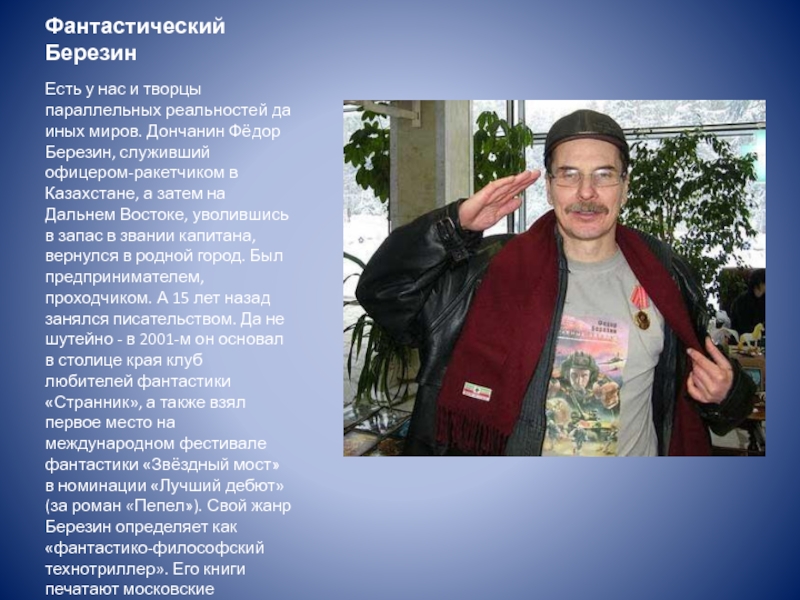 Дончанин Фёдор Березин, служивший офицером-ракетчиком в Казахстане, а затем на Дальнем Востоке, уволившись в запас в звании капитана, вернулся в родной город. Был предпринимателем, проходчиком. А 15 лет назад занялся писательством. Да не шутейно - в 2001-м он основал в столице края клуб любителей фантастики «Странник», а также взял первое место на международном фестивале фантастики «Звёздный мост» в номинации «Лучший дебют» (за роман «Пепел»). Свой жанр Березин определяет как «фантастико-философский технотриллер». Его книги печатают московские издательства.
