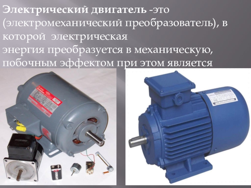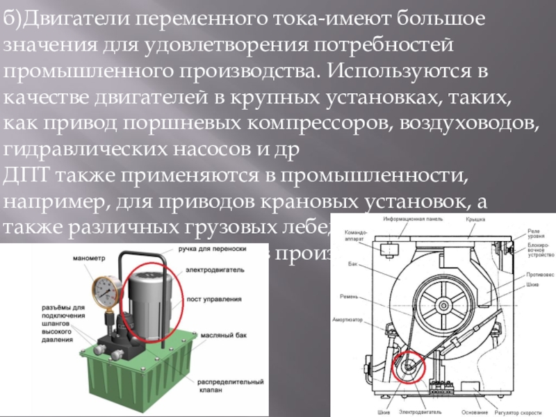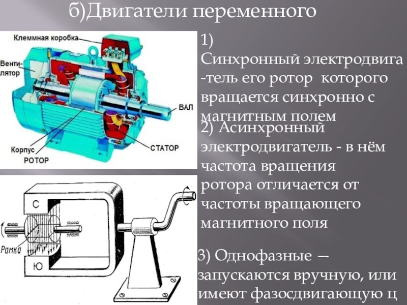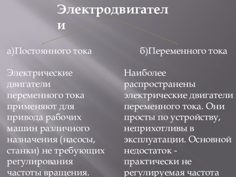 электрические двигатели переменного тока. Они просты по устройству, неприхотливы в эксплуатации. Основной недостаток - практически не регулируемая частота вращения.