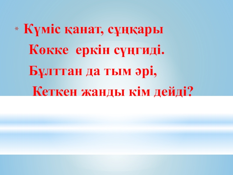 Күміс қанат, сұңқары  Көкке еркін сүңгиді.  Бұлттан да тым әрі,   Кеткен жанды