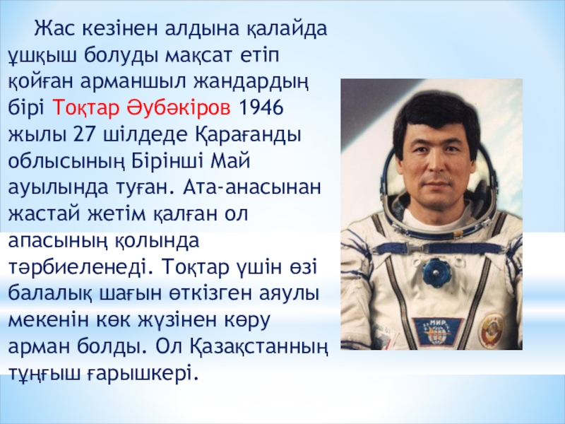бірі Тоқтар Әубәкіров 1946 жылы 27 шілдеде Қарағанды облысының Бірінші Май ауылында туған. Ата-анасынан жастай жетім қалған ол апасының қолында тәрбиеленеді. Тоқтар үшін өзі балалық шағын өткізген аяулы мекенін көк жүзінен көру арман болды. Ол Қазақстанның тұңғыш ғарышкері.