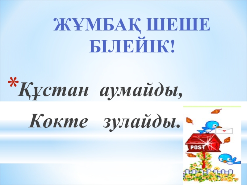 Құстан аумайды,  Көкте  зулайды.ЖҰМБАҚ ШЕШЕ БІЛЕЙІК!