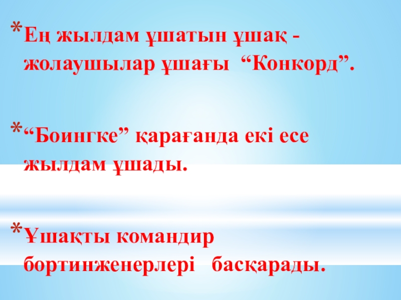 Слайд 4Ең жылдам ұшатын ұшақ - жолаушылар ұшағы “Конкорд”.