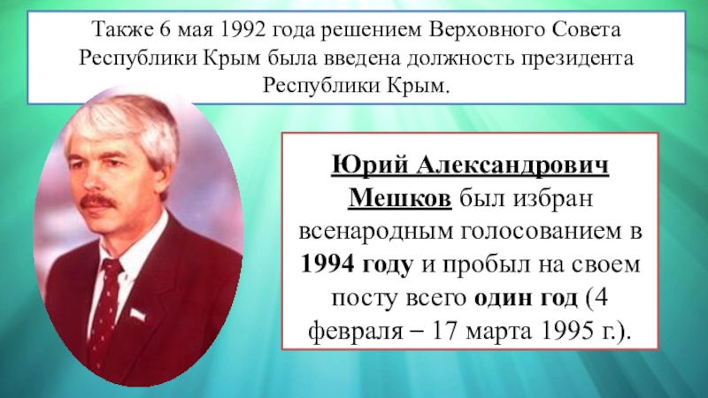 Слайд 33Также 6 мая 1992 года решением Верховного Совета Республики Крым была