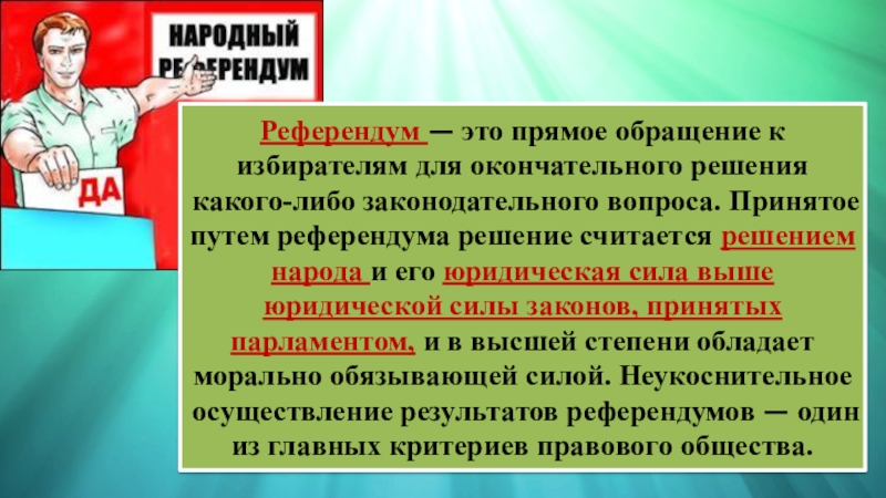 Слайд 14Референдум — это прямое обращение к избирателям для окончательного решения какого-либо