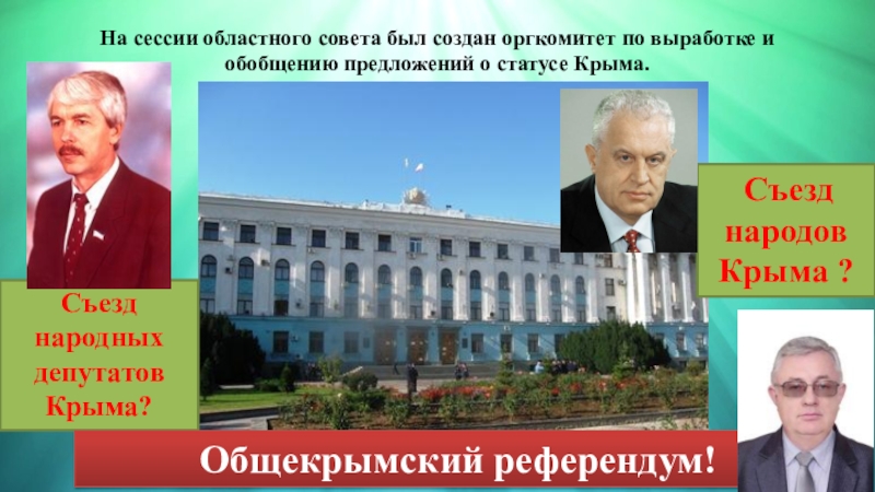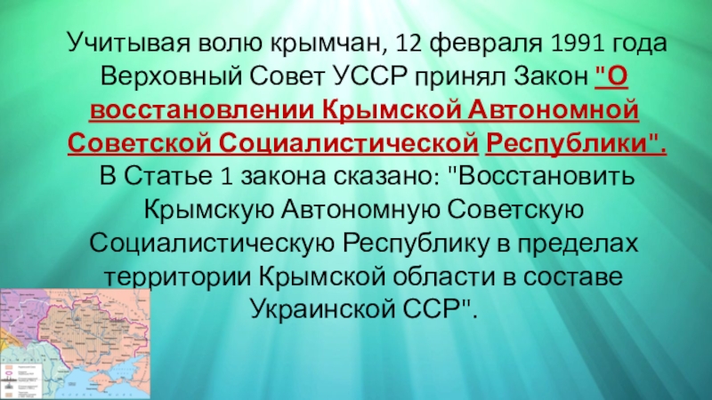 Слайд 23Учитывая волю крымчан, 12 февраля 1991 года Верховный Совет УССР принял