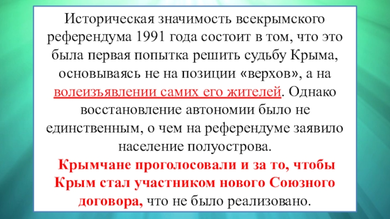 Слайд 36Историческая значимость всекрымского референдума 1991 года состоит в том, что это