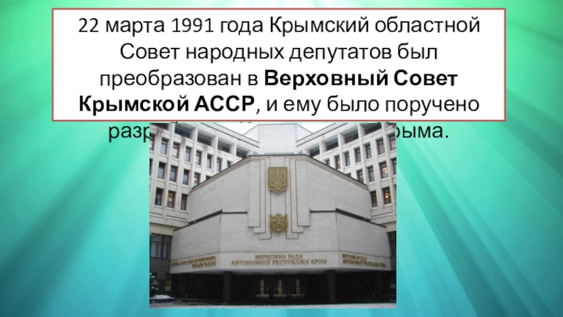 Слайд 2822 марта 1991 года Крымский областной Совет народных депутатов был преобразован