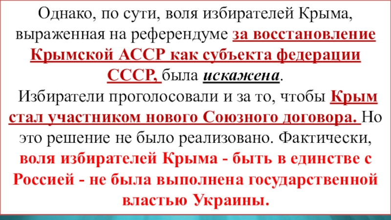 Слайд 27Однако, по сути, воля избирателей Крыма, выраженная на референдуме за восстановление