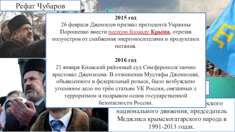 26 февраля Джемилев призвал президента Украины Порошенко ввести полную блокаду Крыма, отрезав полуостров от снабжения энергоносителями и продуктами питания.