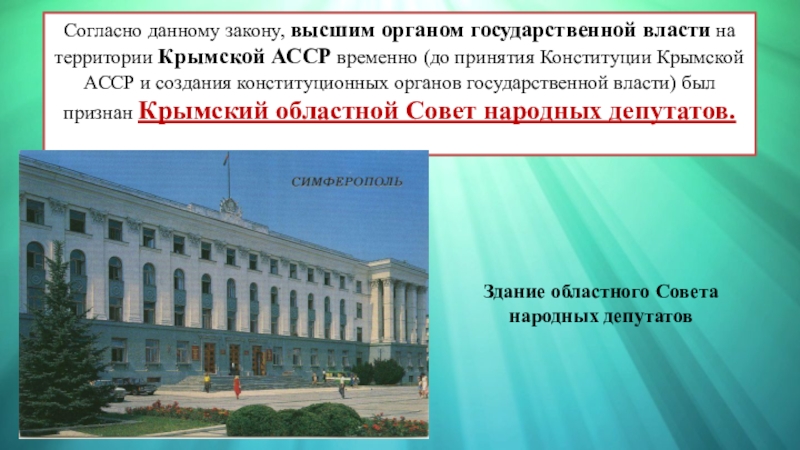 Слайд 24Согласно данному закону, высшим органом государственной власти на территории Крымской АССР