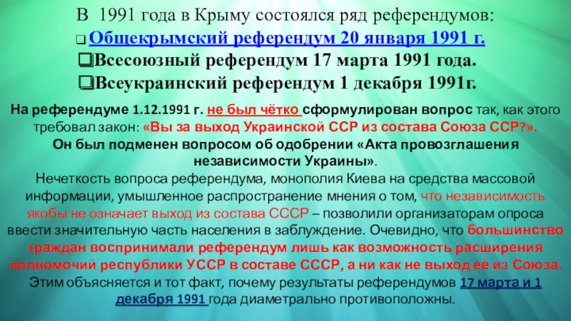 Слайд 15В 1991 года в Крыму состоялся ряд референдумов: