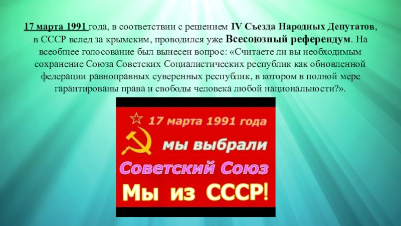 Депутатов, в СССР вслед за крымским, проводился уже Всесоюзный референдум. На всеобщее голосование был вынесен вопрос: «Считаете ли вы необходимым сохранение Союза Советских Социалистических республик как обновленной федерации равноправных суверенных республик, в котором в полной мере гарантированы права и свободы человека любой национальности?».