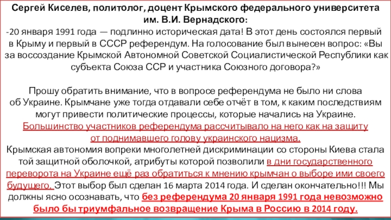 Крымская автономия вопреки многолетней дискриминации со стороны Киева стала той защитной оболочкой, атрибуты которой позволили в дни государственного переворота на Украине ещё раз обратиться к мнению крымчан о выборе ими своего будущего. Этот выбор был сделан 16 марта 2014 года. И сделан окончательно!!! Мы должны ясно осознавать, что без референдума 20 января 1991 года невозможно было бы триумфальное возвращение Крыма в Россию в 2014 году.