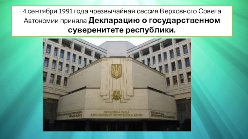 Слайд 294 сентября 1991 года чрезвычайная сессия Верховного Совета Автономии приняла Декларацию