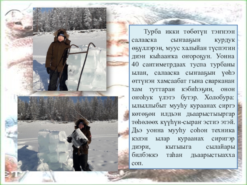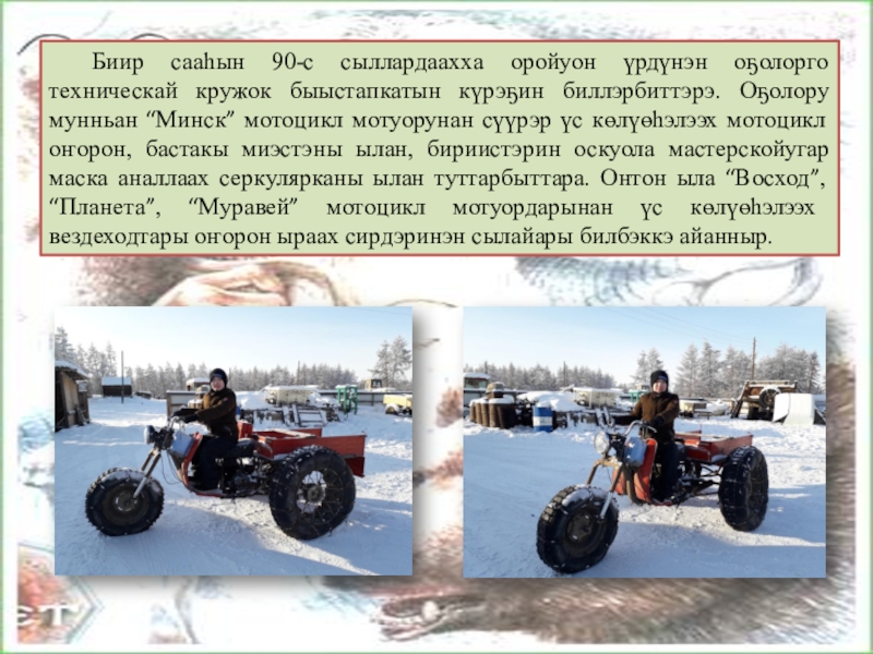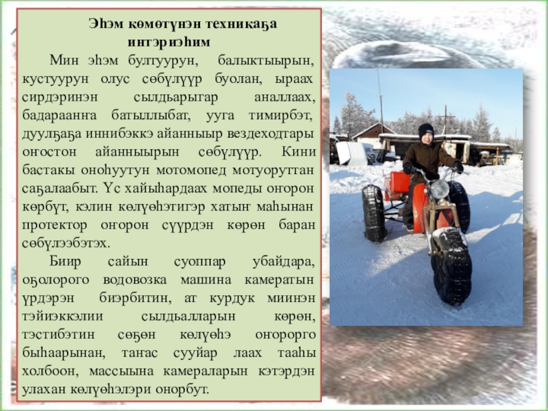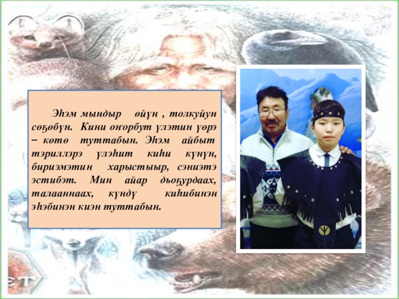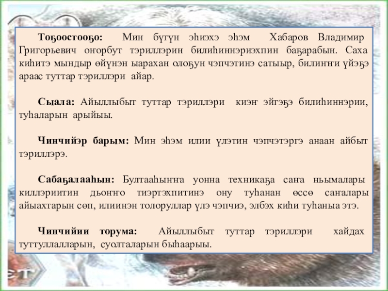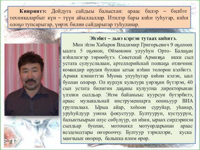 Мин эһэм Хабаров Владимир Григорьевич 9 оҕолоох ыалга 5 оҕонон, Өймөкөөн улууһун Орто- Балаҕан нэһилиэгэр төрөөбүтэ. Советскай Армияҕа икки сыл устата сулууспалаан, артеллерийскай полкаҕа отличник командир орудия буолан ытык иэһин толорон кэлбитэ. Армия кэнниттэн Муома улууһугар көһөн кэлэн, ыал буолан олорор. Ол курдук культура үөрэҕин бүтэрэн, 40 сыл устата билигин даҕаны кулуупка директорынан үлэлии сылдьар. Эһэм байаныыс куурсун бутэрбитэ, араас музыкальнай инструменнарга оонньуур ВИА группалаах. Ырыа айар, хоһоон суруйар, уһанар, уруһуйдуур уонна фокустуур. Бултуурун, кустуурун, балыктыырын олус сөбүлүүр, ол иһин, ыраах сирдэринэн сылдьар буолан, мотоцикл мотуордарынан араас вездеходтары оҥорооччу. Бултуур тэриллэри, куска манчыык онорор, балыкка илим өрөр.