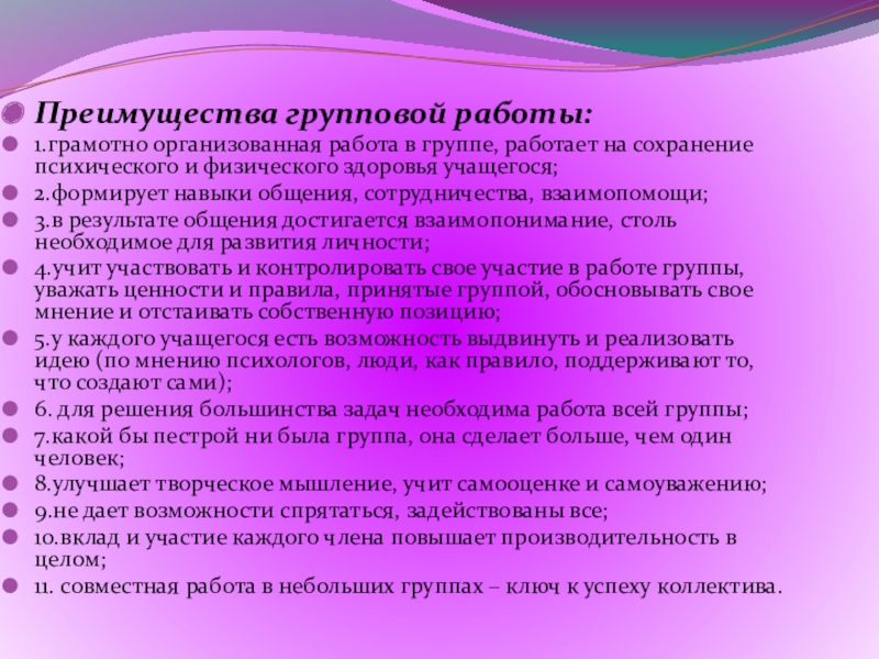 Преимущества групповой работы: