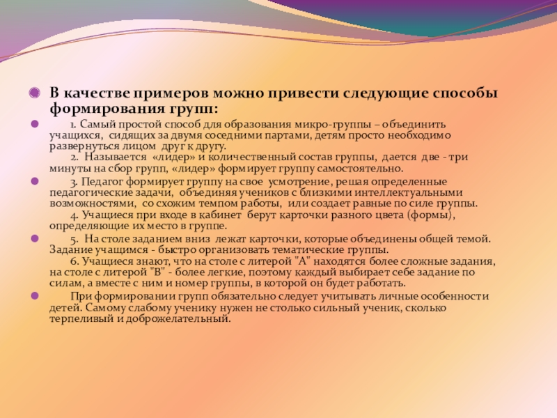 3. Педагог формирует группу на свое усмотрение, решая определенные педагогические задачи, объединяя учеников с близкими интеллектуальными возможностями, со схожим темпом работы, или создает равные по силе группы.