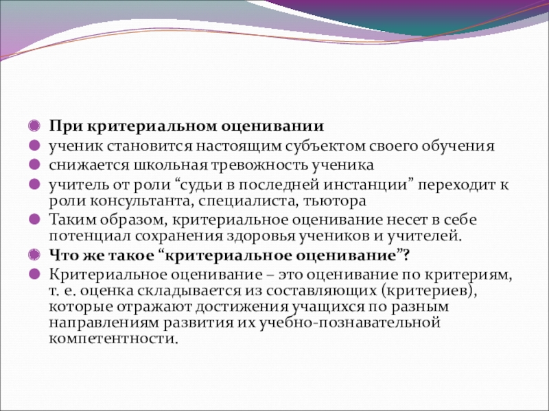 Критериальное оценивание – это оценивание по критериям, т. е. оценка складывается из составляющих (критериев), которые отражают достижения учащихся по разным направлениям развития их учебно-познавательной компетентности.