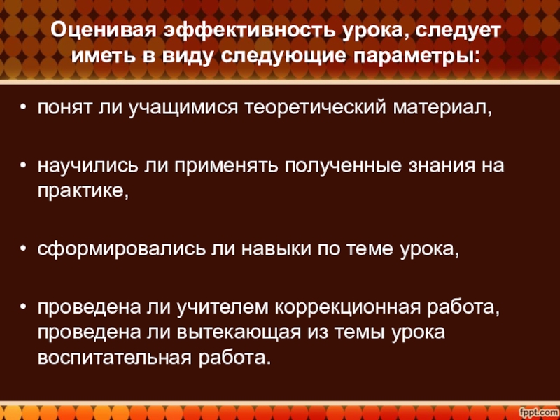 Эффективность урока - это его результативность, т.е. что дал учащимся урок, насколько они продвинулись в усвоении учебного материала
