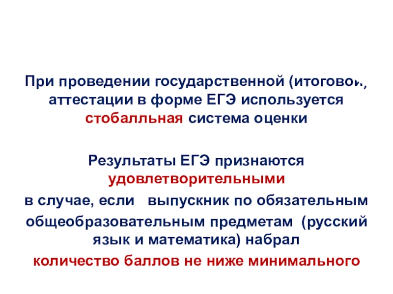 ЕГЭ-2019При проведении государственной (итоговой) аттестации в форме ЕГЭ используется стобалльная система оценкиРезультаты ЕГЭ признаются  удовлетворительными в