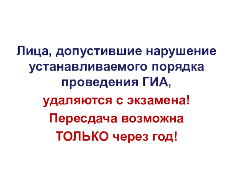 ЕГЭ-2019Лица, допустившие нарушение устанавливаемого порядка проведения ГИА, удаляются с экзамена!Пересдача возможна ТОЛЬКО через год!