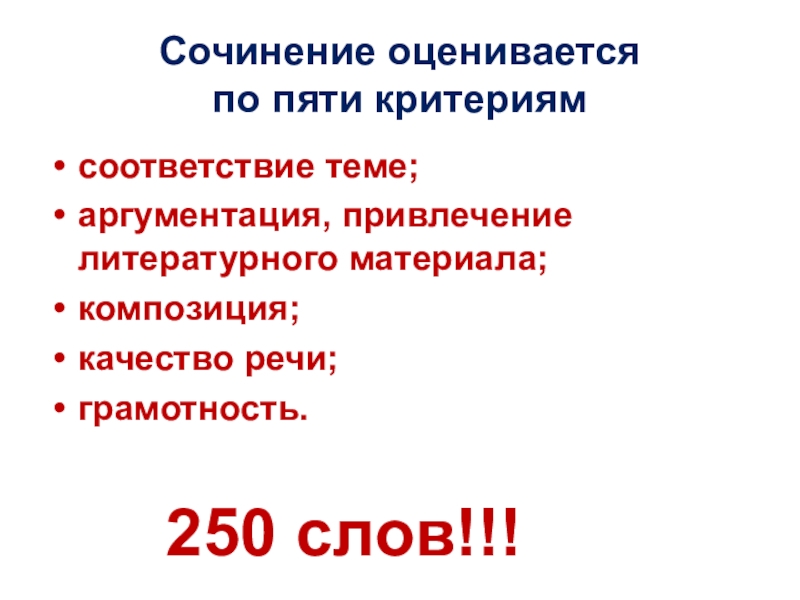 Сочинение оценивается  по пяти критериямсоответствие теме; аргументация, привлечение литературного материала; композиция;качество речи; грамотность.
