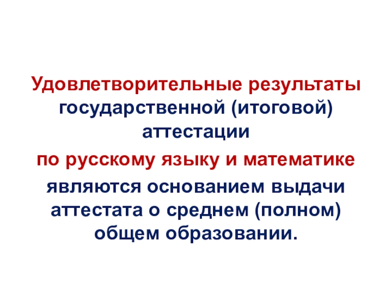 ЕГЭ-2019Удовлетворительные результаты государственной (итоговой) аттестации по русскому языку и математике являются основанием выдачи аттестата о среднем (полном)
