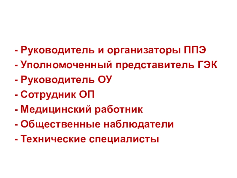 ЕГЭ-2019- Руководитель и организаторы ППЭ- Уполномоченный представитель ГЭК- Руководитель ОУ- Сотрудник ОП- Медицинский работник- Общественные наблюдатели- Технические