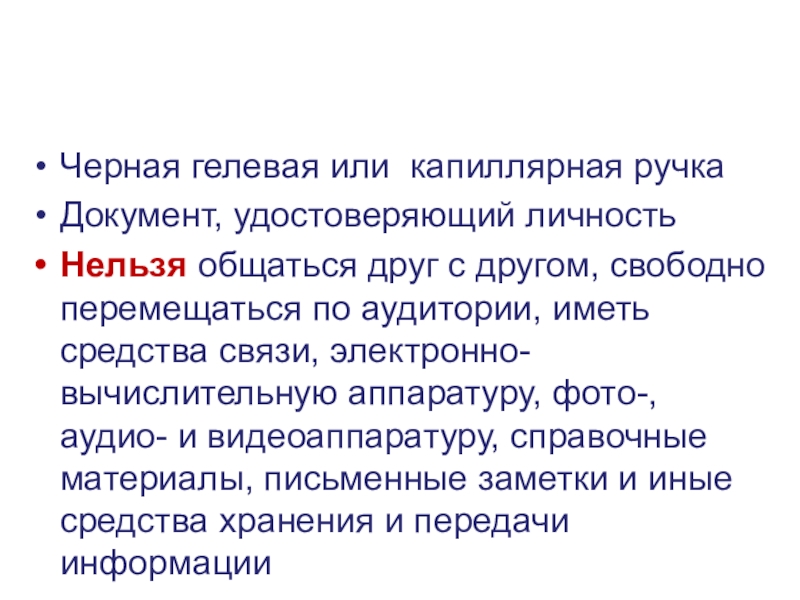 с другом, свободно перемещаться по аудитории, иметь средства связи, электронно-вычислительную аппаратуру, фото-, аудио- и видеоаппаратуру, справочные материалы, письменные заметки и иные средства хранения и передачи информации