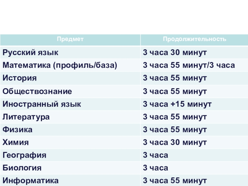 ЕГЭ-2019В продолжительность экзаменов не включается время, выделенное на подготовительные мероприятия (инструктаж, заполнение регистрационных бланков и т.д.)