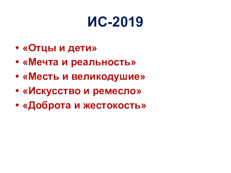 ИС-2019«Отцы и дети»«Мечта и реальность»«Месть и великодушие»«Искусство и ремесло»«Доброта и жестокость»