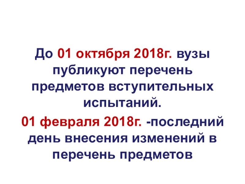 До 01 октября 2018г. вузы публикуют перечень предметов вступительных испытаний.