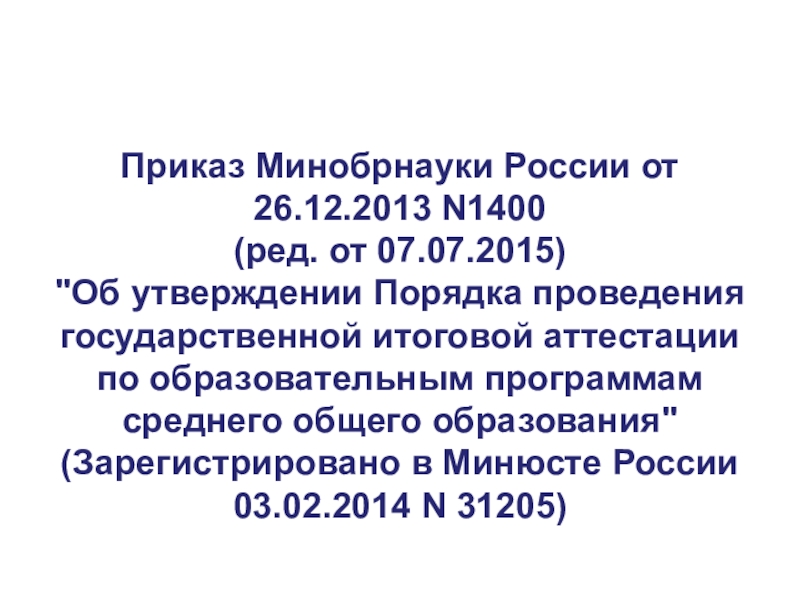 Приказ Минобрнауки России от 26.12.2013 N1400 (ред. от 07.07.2015) "Об утверждении Порядка проведения государственной итоговой аттестации по образовательным программам среднего общего образования" (Зарегистрировано в Минюсте России 03.02.2014 N 31205)