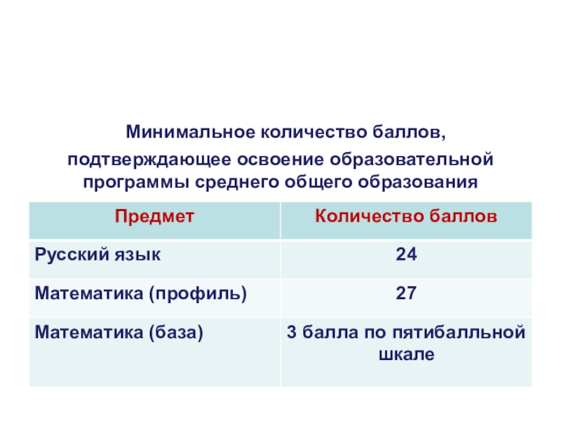 ЕГЭ-2018 Минимальное количество баллов, подтверждающее освоение образовательной программы среднего общего образования