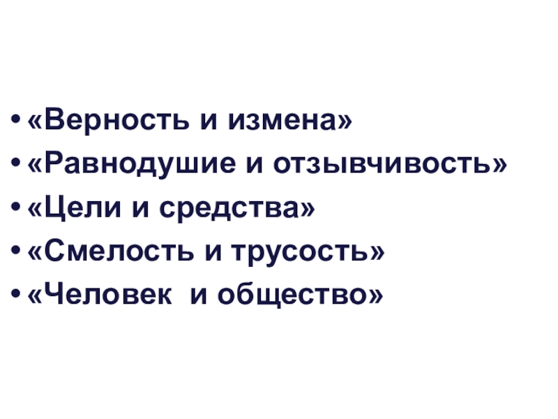 ИС-2018«Верность и измена»«Равнодушие и отзывчивость»«Цели и средства»«Смелость и трусость»«Человек и общество»