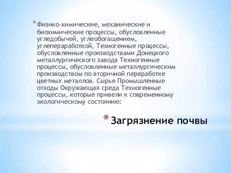 Загрязнение почвыФизико-химические, механические и биохимические процессы, обусловленные угледобычей, углеобогащением, углепераработкой, Техногенные процессы, обусловленные производствами Донецкого металлургического завода