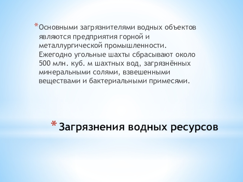 Загрязнения водных ресурсовОсновными загрязнителями водных объектов являются предприятия горной и металлургической промышленности. Ежегодно угольные шахты сбрасывают около