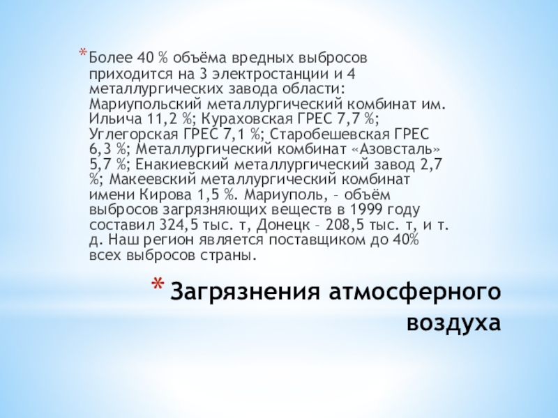 электростанции и 4 металлургических завода области: Мариупольский металлургический комбинат им. Ильича 11,2 %; Кураховская ГРЕС 7,7 %; Углегорская ГРЕС 7,1 %; Старобешевская ГРЕС 6,3 %; Металлургический комбинат «Азовсталь» 5,7 %; Енакиевский металлургический завод 2,7 %; Макеевский металлургический комбинат имени Кирова 1,5 %. Мариуполь, – объём выбросов загрязняющих веществ в 1999 году составил 324,5 тыс. т, Донецк – 208,5 тыс. т, и т.д. Наш регион является поставщиком до 40% всех выбросов страны.