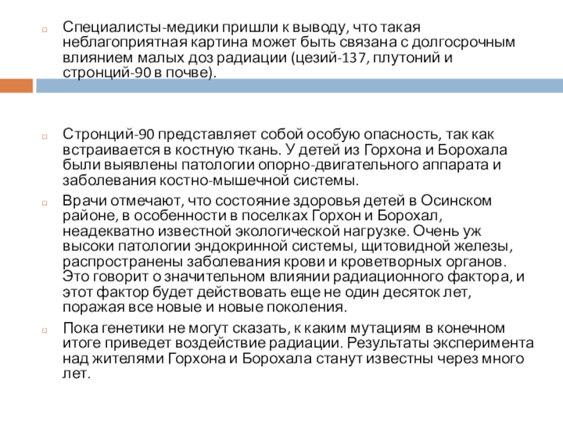 Врачи отмечают, что состояние здоровья детей в Осинском районе, в особенности в поселках Горхон и Борохал, неадекватно известной экологической нагрузке. Очень уж высоки патологии эндокринной системы, щитовидной железы, распространены заболевания крови и кроветворных органов. Это говорит о значительном влиянии радиационного фактора, и этот фактор будет действовать еще не один десяток лет, поражая все новые и новые поколения.