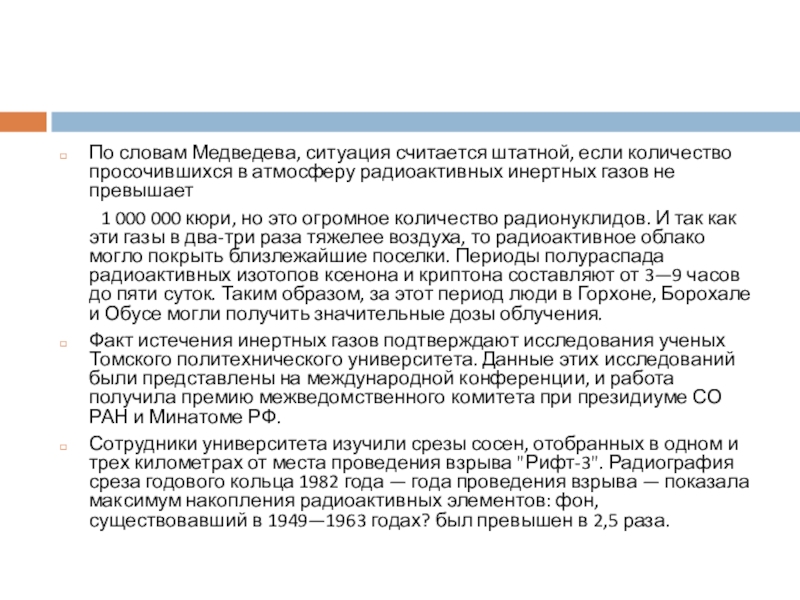 1 000 000 кюри, но это огромное количество радионуклидов. И так как эти газы в два-три раза тяжелее воздуха, то радиоактивное облако могло покрыть близлежайшие поселки. Периоды полураспада радиоактивных изотопов ксенона и криптона составляют от 3—9 часов до пяти суток. Таким образом, за этот период люди в Горхоне, Борохале и Обусе могли получить значительные дозы облучения.