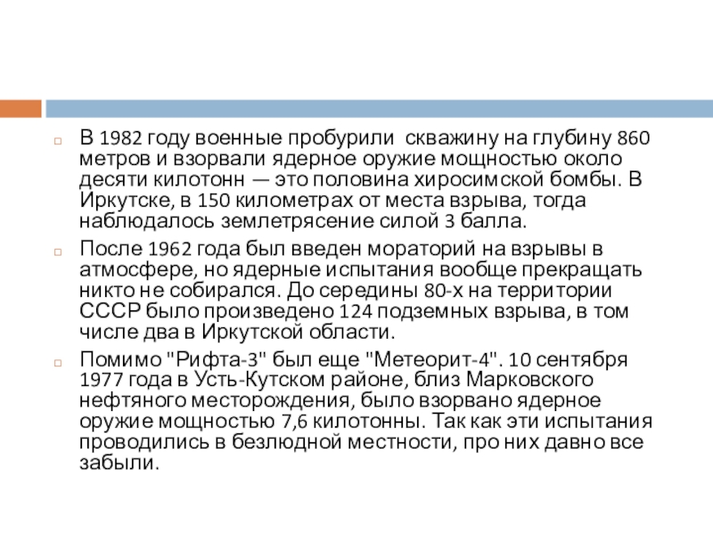 После 1962 года был введен мораторий на взрывы в атмосфере, но ядерные испытания вообще прекращать никто не собирался. До середины 80-х на территории СССР было произведено 124 подземных взрыва, в том числе два в Иркутской области.
