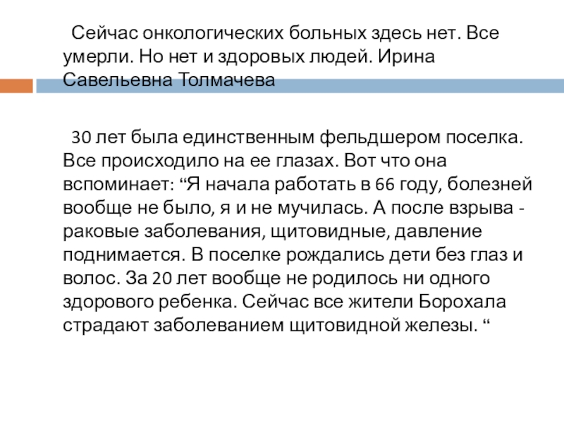 30 лет была единственным фельдшером поселка. Все происходило на ее глазах. Вот что она вспоминает: “Я начала работать в 66 году, болезней вообще не было, я и не мучилась. А после взрыва - раковые заболевания, щитовидные, давление поднимается. В поселке рождались дети без глаз и волос. За 20 лет вообще не родилось ни одного здорового ребенка. Сейчас все жители Борохала страдают заболеванием щитовидной железы. “