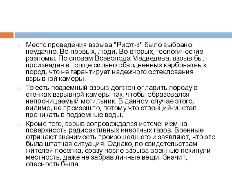 разломы. По словам Всеволода Медведева, взрыв был произведен в толще сильно обводненных карбонатных пород, что не гарантирует надежного остеклования взрывной камеры.