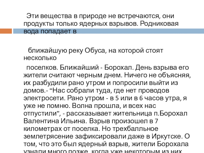 поселков. Ближайший - Борохал. День взрыва его жители считают черным днем. Ничего не объясняя, их разбудили рано утром и попросили выйти из домов.- “Нас собрали туда, где нет проводов электросети. Рано утром - в 5 или в 6 часов утра, я уже не помню. Волна прошла, и всех нас отпустили”, - рассказывает жительница п.Борохал Валентина Ильина. Взрыв произошел в 7 километрах от поселка. Но трехбалльное землетрясение зафиксировали даже в Иркутске. О том, что это был ядерный взрыв, жители Борохала узнали много позже, когда уже некоторым из них поставили диагноз - рак.