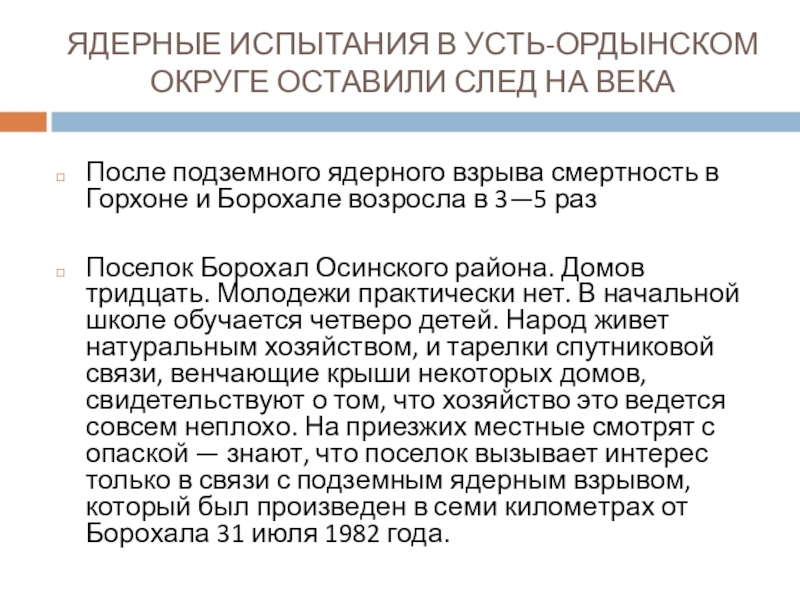 Слайд 2ЯДЕРНЫЕ ИСПЫТАНИЯ В УСТЬ-ОРДЫНСКОМ ОКРУГЕ ОСТАВИЛИ СЛЕД НА ВЕКА