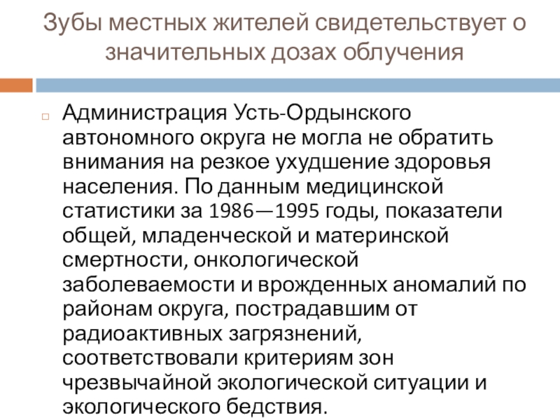 Слайд 13Зубы местных жителей свидетельствует о значительных дозах облучения