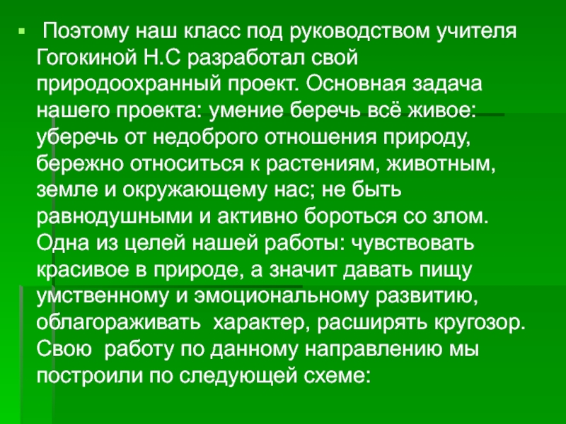 природоохранный проект. Основная задача нашего проекта: умение беречь всё живое: уберечь от недоброго отношения природу, бережно относиться к растениям, животным, земле и окружающему нас; не быть равнодушными и активно бороться со злом. Одна из целей нашей работы: чувствовать красивое в природе, а значит давать пищу умственному и эмоциональному развитию, облагораживать характер, расширять кругозор. Свою работу по данному направлению мы построили по следующей схеме: